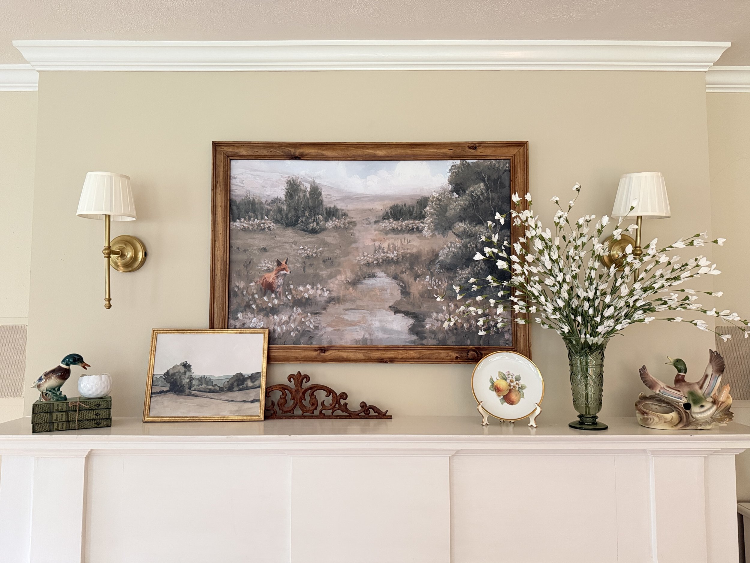 The vintage books and smaller landscape scene spread the green tones across the mantle, a color I love. And the old rusty iron grate I picked up at a garden show decades ago added an antique, weathered touch. Later I realized the gold gilding on the plate, lamps, and small print brought some fancy gilding to the scene.