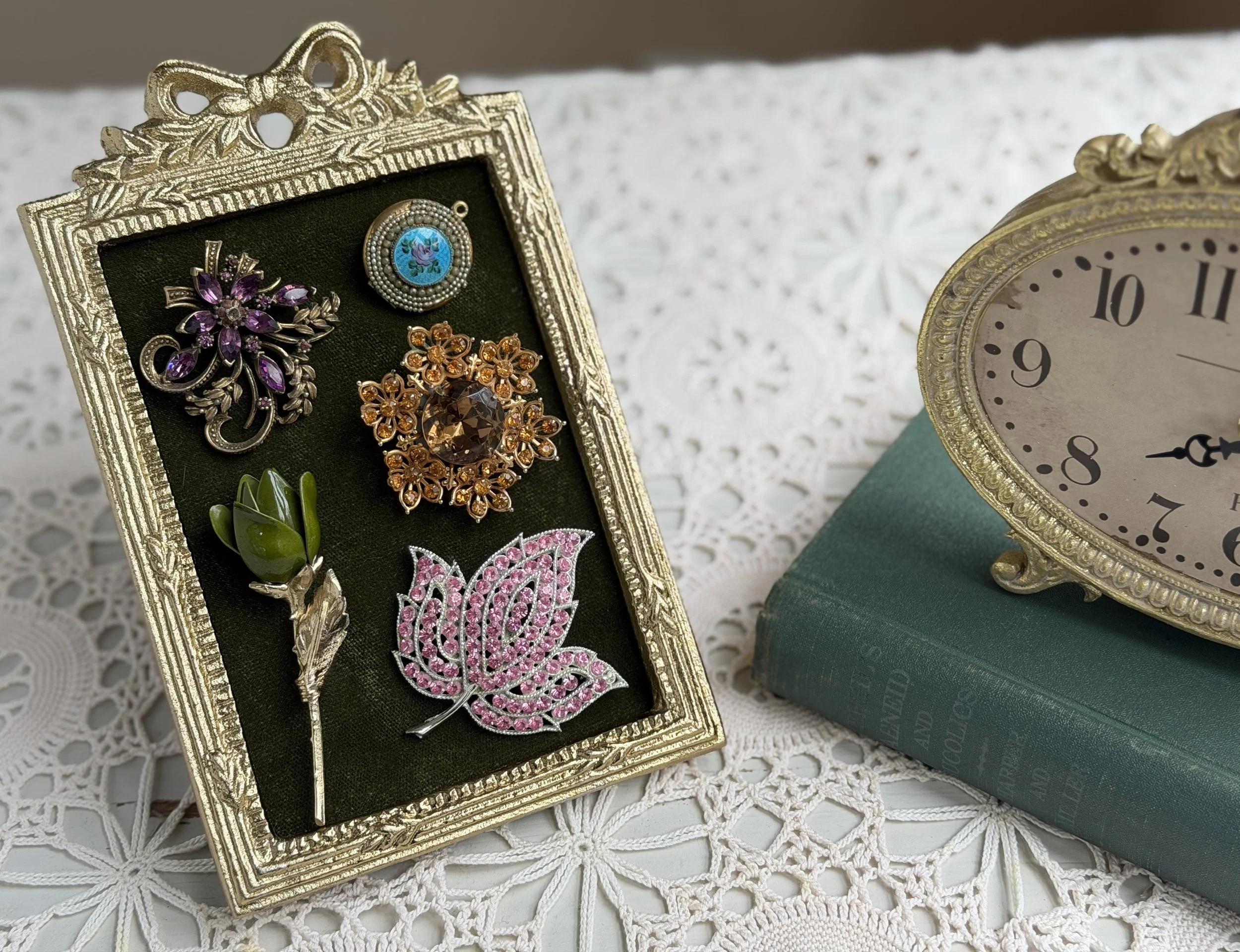 Pin a floral brooch to a scrap piece of velvet and frame it in a traditional, wood or fancy, metal frame. If you’re pressed for time, you can simply tuck them into your favorite pin board. It’s a way to let your family’s history bloom alongside your home’s botanical story.