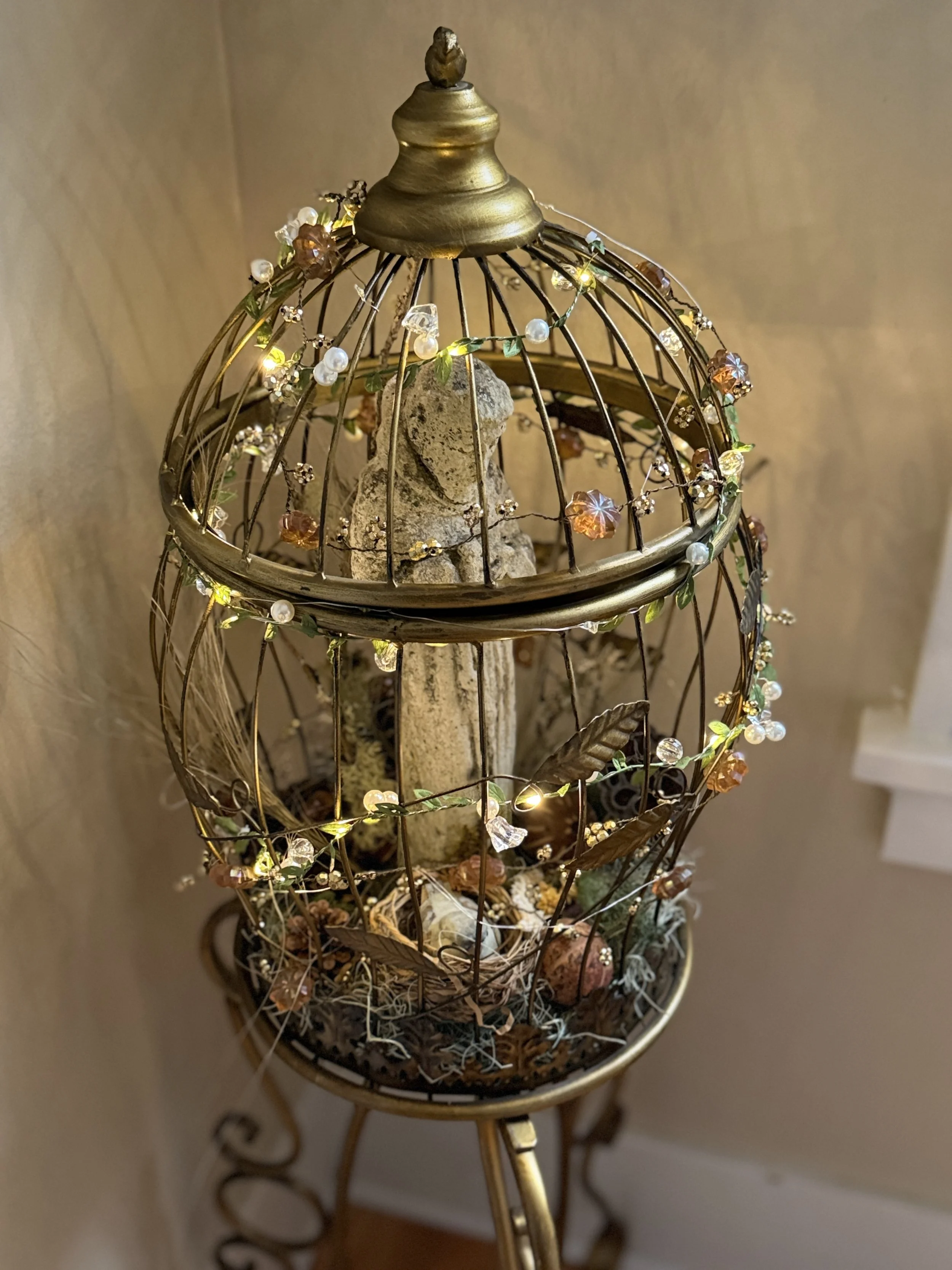 For a more vertical element on a buffet or desk, dress up a decorative birdcage. Nowadays, fairy lights with faux leaves are commonly available in craft stores. First, scatter dried leaves or decorative moss on the bottom of the cage. Place a small stone statue or sculpture inside, something weathered or worn, or anything that evokes history like an old watering can or iron fleur-de-lis. Then weave a string of leafy fairy lights through the bars.